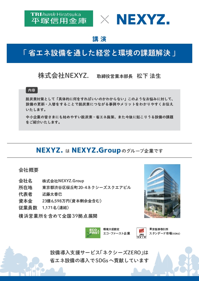 当セミナーでは、平塚信用金庫のお取引先様に向けて「省エネ設備を通した経営と環境の課題解決 ~脱炭素で拓く中小企業の未来~」をテーマに、脱炭素経営の具体策をご提示し、気候変動や電気代高騰の改善の具体策として、LED、空調、キュービクルなどの設備更新が課題解決、ひいては脱炭素経営に繋がる旨を解説しました。